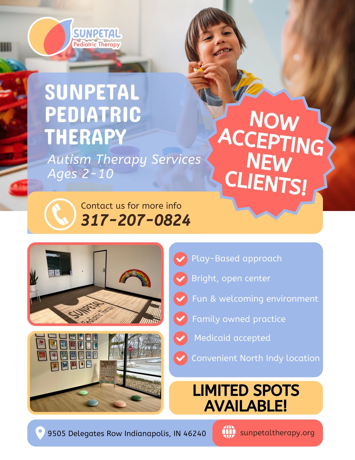 We currently have openings for ABA Therapy at our beautiful sunlit center in north Indianapolis! At Sunpetal, we provide play-based ABA Therapy for children with autism ages 2-10. Our smaller, close-knit team allows us to ensure quality, consistency, and individualized support for therapy services you can trust!